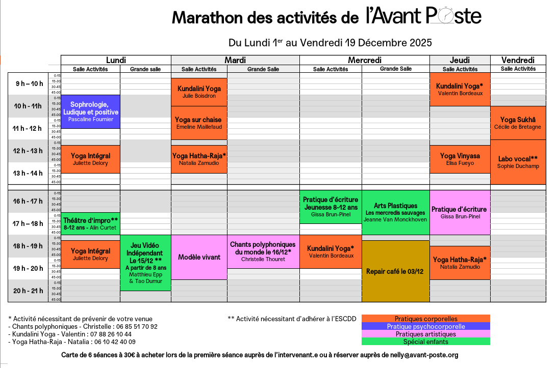 En pratique : carte de 6 séances à 30€ à acheter lors de la première séance auprès de l’intervenant.e ou à réserver auprès de nelly@avant-poste.org